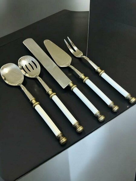 • Paslanmaz Çelik Lüks 5 Parça Servis Seti Sofralarınıza şıklık katacak oldukça gösterişli bir modeldir. Ürün İçeriği 1 Kaşık 1 Spatula 1 Çatal 1 Bıçak 1 Süzgeçli Kaşık kevgir, kaşık, çatal 28 cm spatula 30 cm bıçak 35 cm