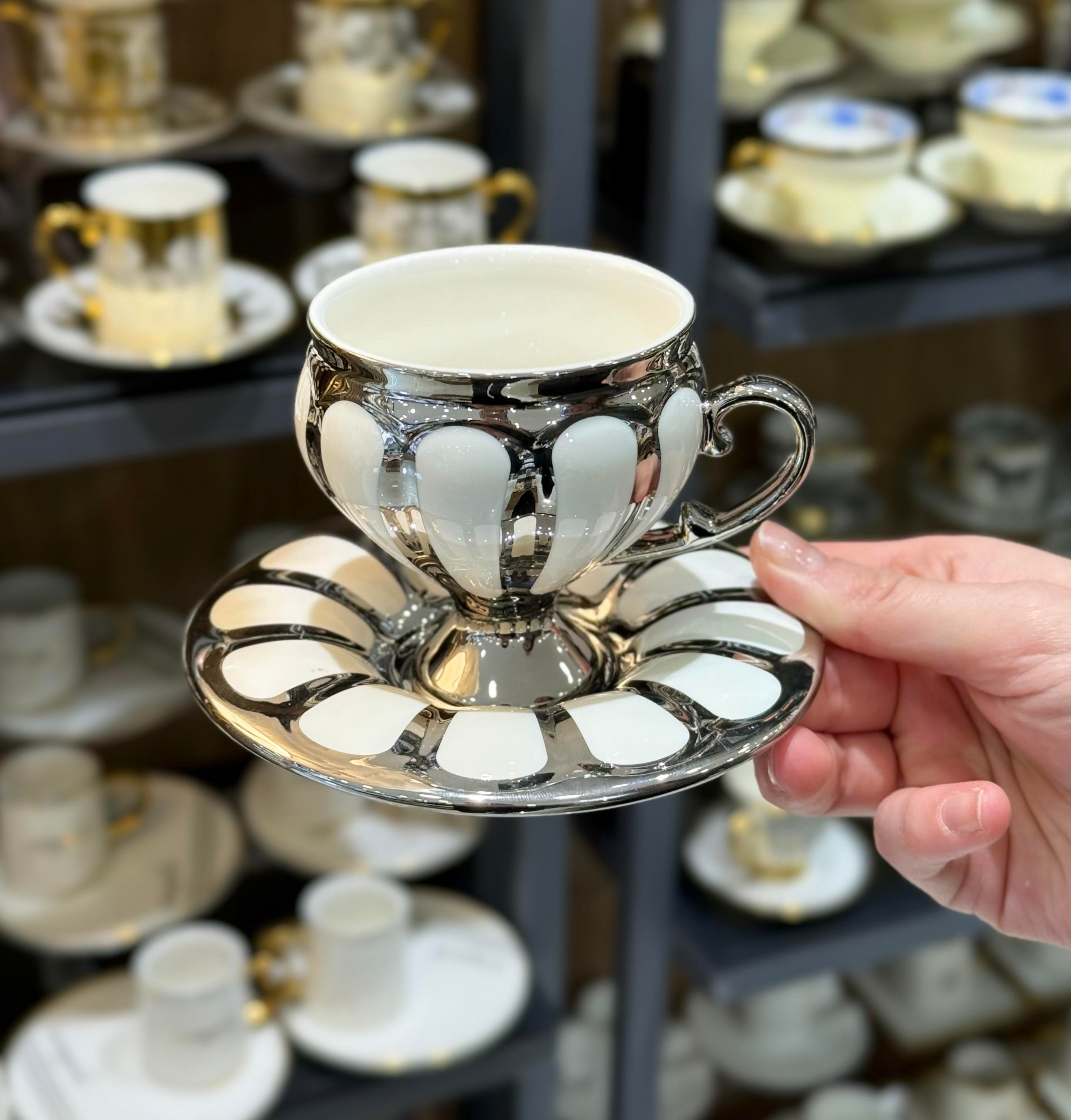 6'lı Karıus Porselen Kahve Fincanı Beyaz Gümüş
